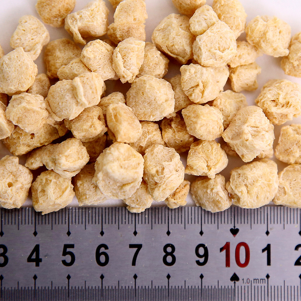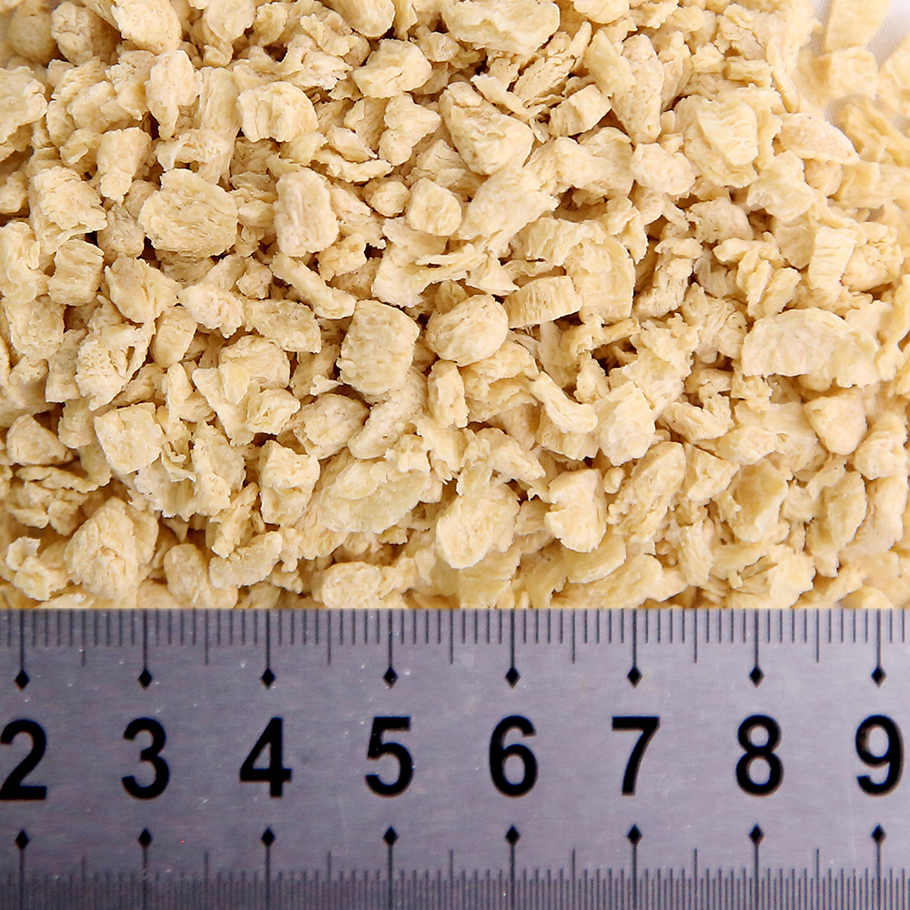 該產(chǎn)品是將分離蛋白、大豆?jié)饪s蛋白、低溫豆粕、谷朊粉、淀粉依產(chǎn)品配方比例經(jīng)擠壓膨化、高溫高壓處理而成,具有良好的吸水性、保油性和類似肉的纖維結(jié)構(gòu),富有咀嚼感,是一種理想的高蛋白肉制品添加物、休閑豆制品的輔料。產(chǎn)品類型包括TW系列、TB系列